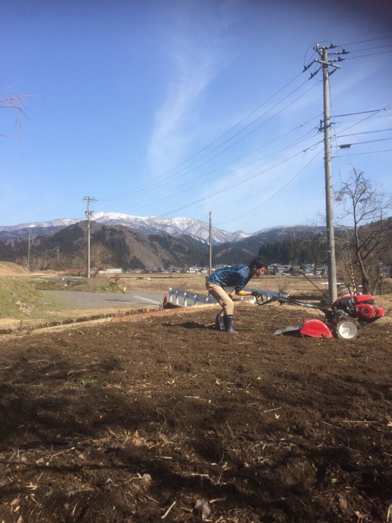 耕運機で開墾!部子山にはまだ雪が残っていました。