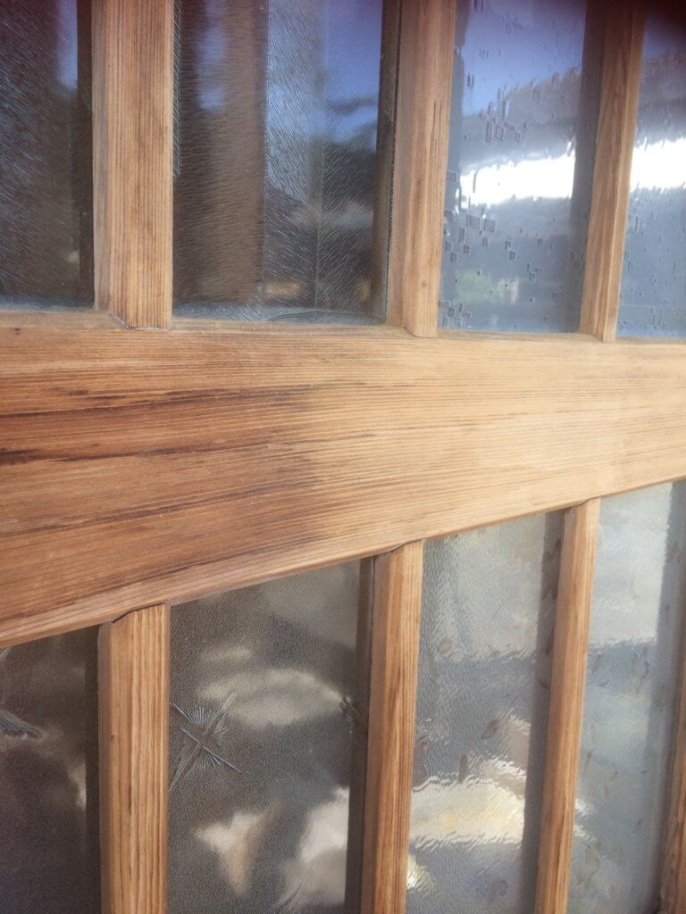 硝子を割らぬよう紙やすりで研磨し、ワトコオイルを塗ってオイル塗装。